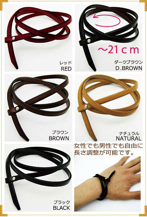 イタリアンレザー本牛革5mm3重巻きブレスレット 商品詳細:長さ、~21cm 幅0.5cm カラー:ブラック、ブラウン、ナチュラル、ダークブラウン、レッド